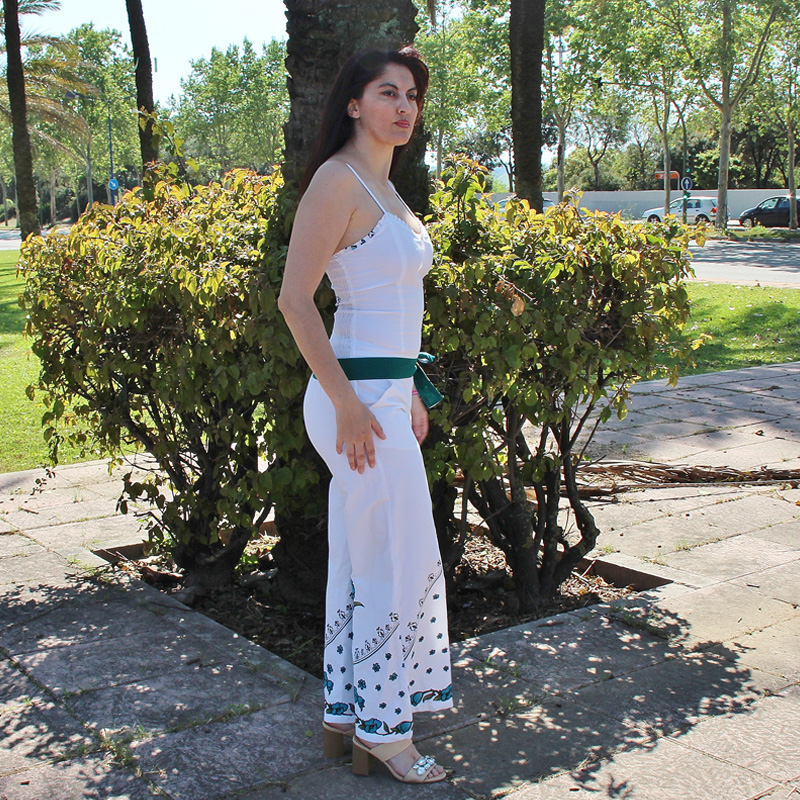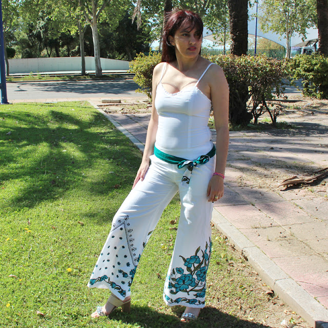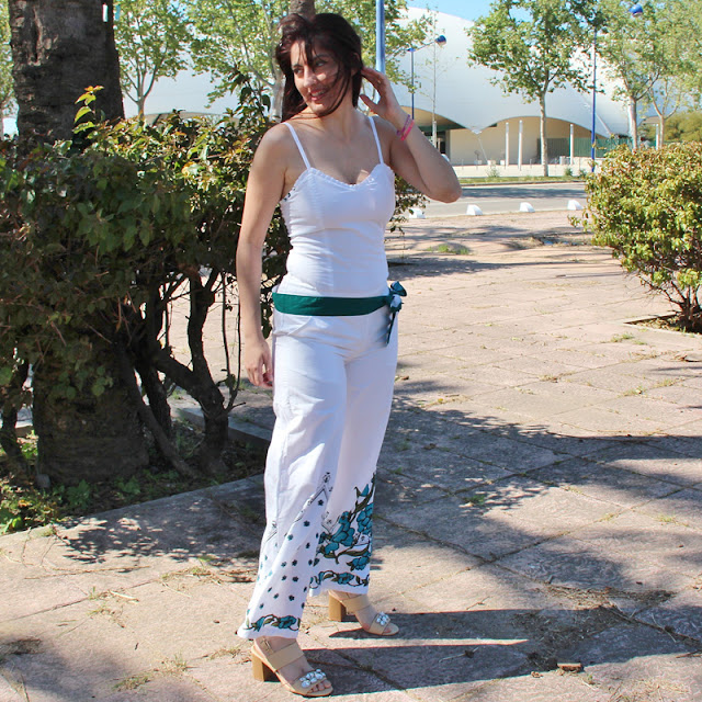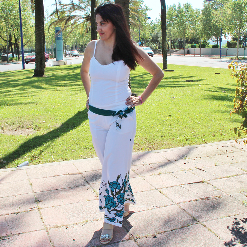 Blanco puro con espectaculares estampados florales, tiene un bonito escote en V con detalles plegaditos que realzan la feminidad. Es el modelo Border Palazzo, aunque en esta tienda online también encontramos el mismo diseño pero con distinto estampado. Yo elegí éste porque el color celeste en combinación con el blanco es uno de mis preferidos para vestir en primavera y verano por la luz y alegría que transmiten.