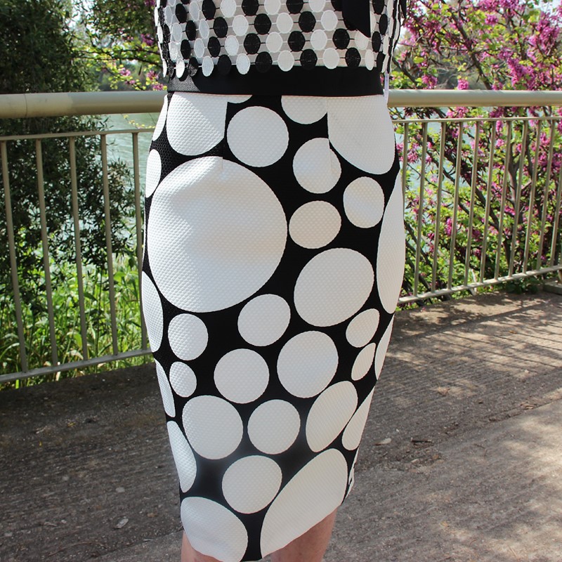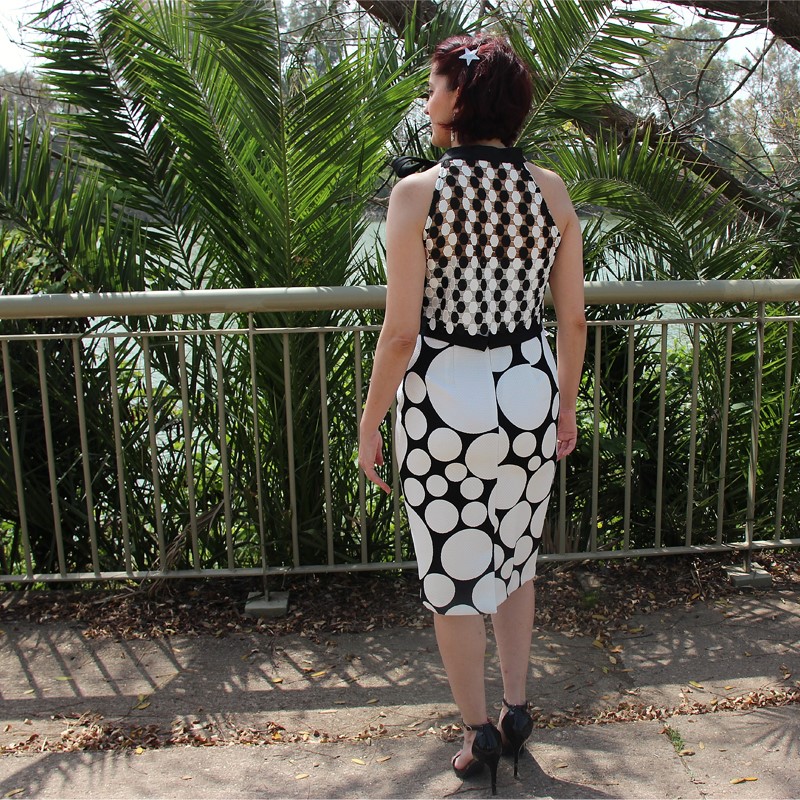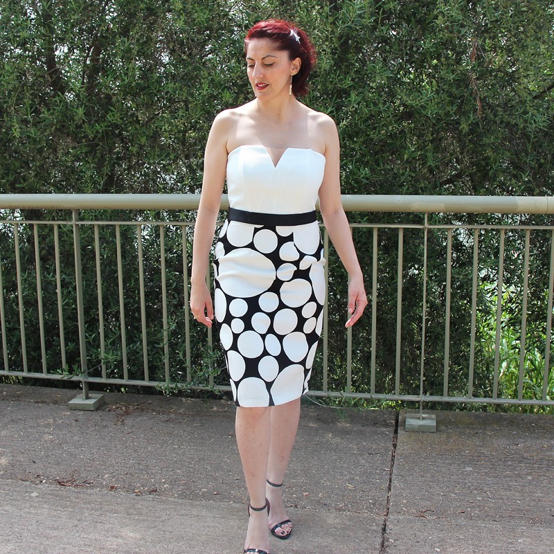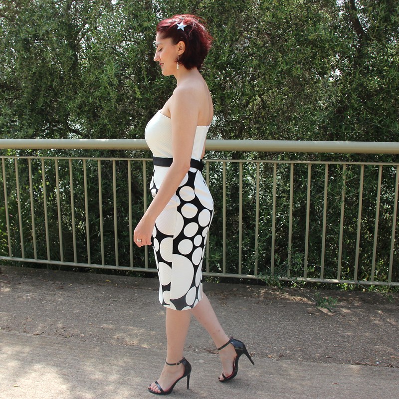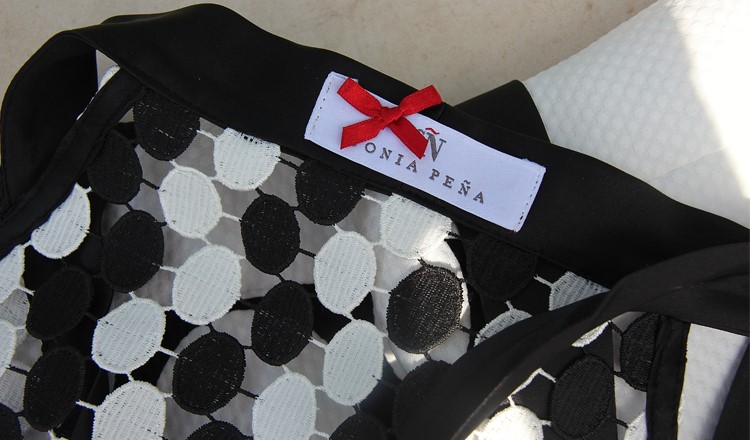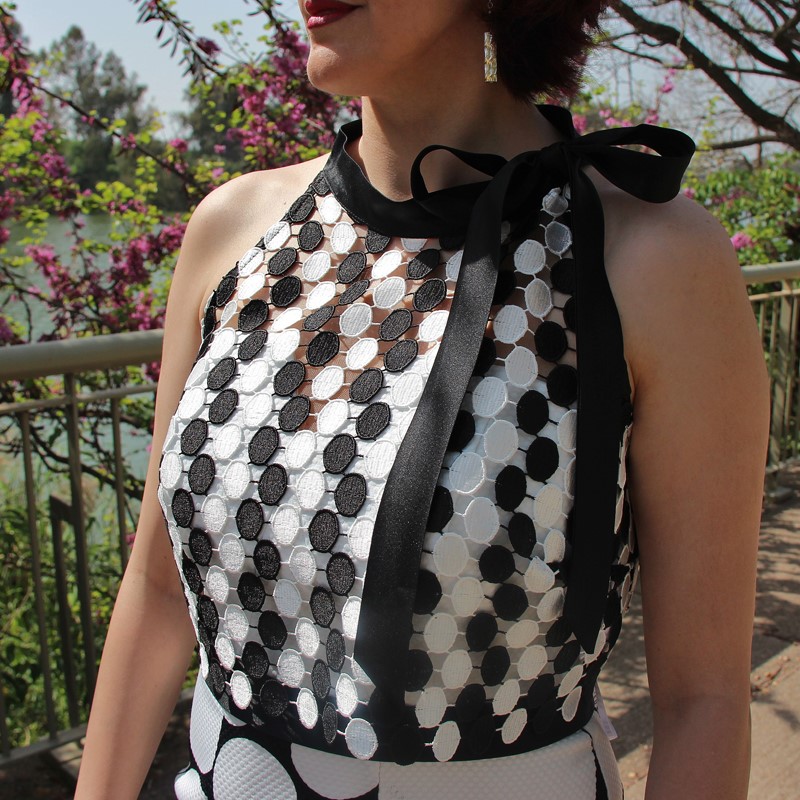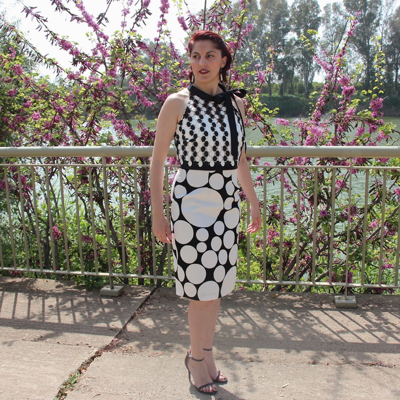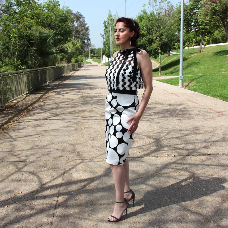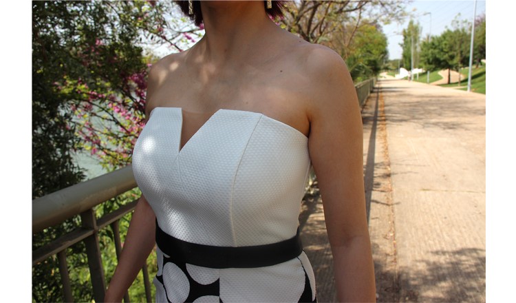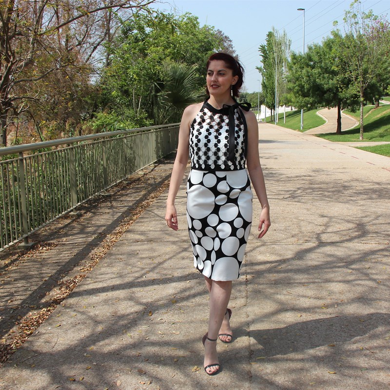 Con estampado en lunares, cinturilla negra y escote en forma de corazón, este vestido cuenta con la peculiaridad de tener dos variaciones. Esto nos da la posibilidad de poder usarlo en varias ocasiones sin dar la sensación de repetir. Y es que lo podemos usar con o sin el complemento: un top calado también de lunares, mangas a la sisa y gran lazada al cuello que lo complementa a la perfección.