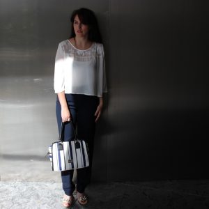 Es un bolso de esos tipo “maletita” (modelo Electra) que tanto me gustan, de estilo náutico en el que predominan las líneas rectas verticales en color azul marino. Tiene cierre de cremallera y asa corta, aunque en su interior también incluye unas asas largas muy fáciles de colocar para que podamos llevarlo al hombro, si así lo preferimos.
